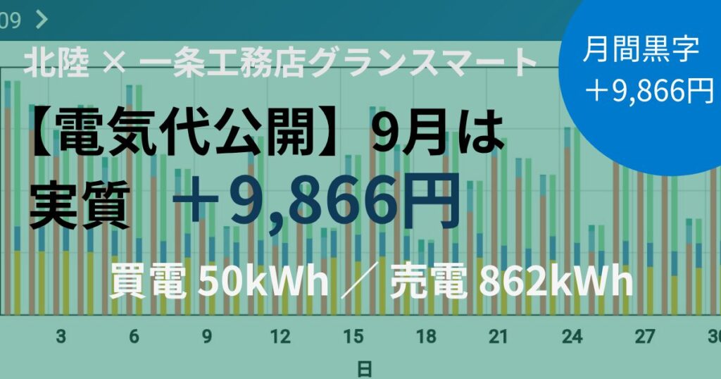 - 【電気代公開】9月は実質+9,866円!来月からの補助金終了でどう変わる?2025年9月の電気代は3,926円、売電収入13,792円で実質+9,866円。10月からの電気代補助金終了で来月以降は上昇見込み。太陽光+蓄電池で黒字を維持した北陸の実データを公開。