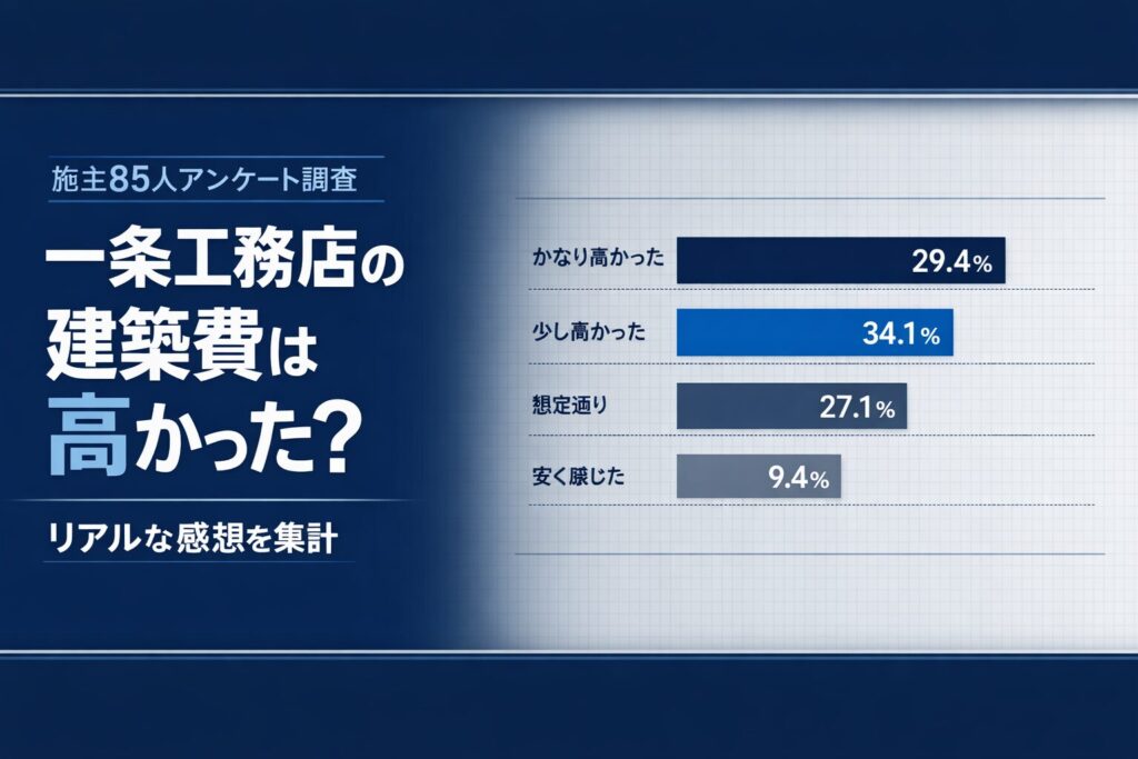 一条工務店の建築費は高いと感じる人が多いのか。施主85人のXアンケートをもとに、「かなり高かった」「少し高かった」「想定通り」などの割合を分析。我が家の実例も交えながら、建築費のリアルな感想を整理します。 -