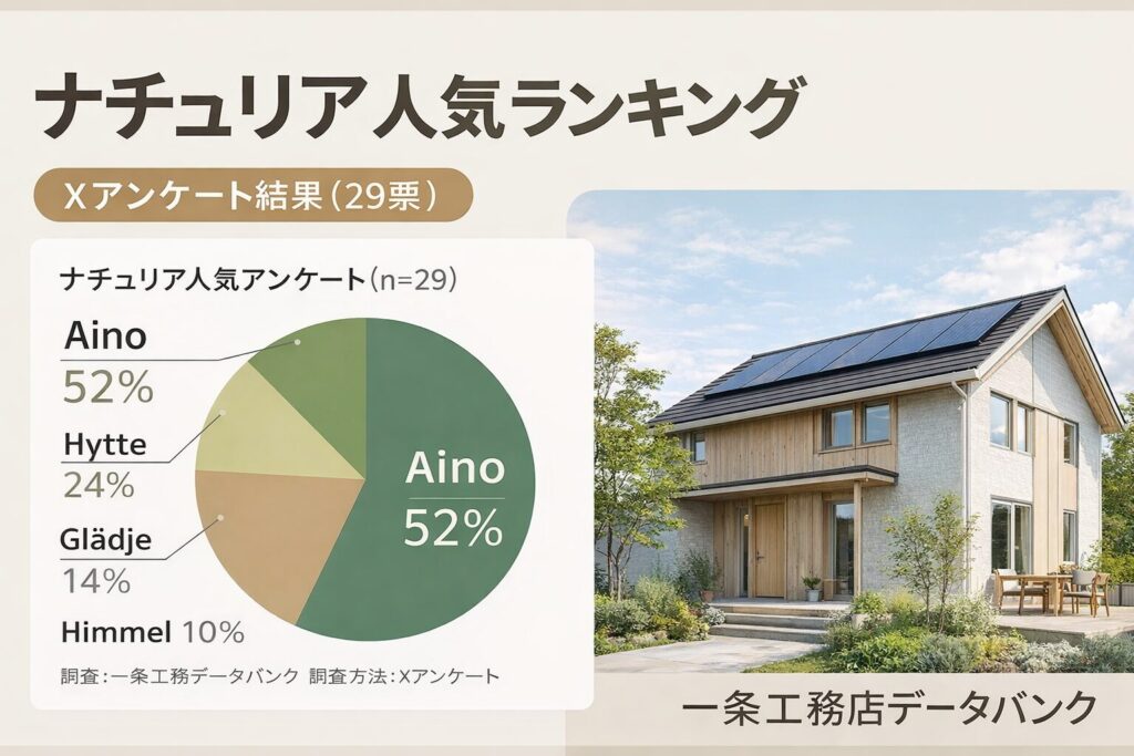 一条工務店の新シリーズ「ナチュリア(Naturia)」は4つの北欧デザインがあります。Aino・Hytte・Glädje・Himmelの人気をXアンケート(29票)で調査しました。実際の人気ランキングと各デザインの特徴を詳しく解説します。 -