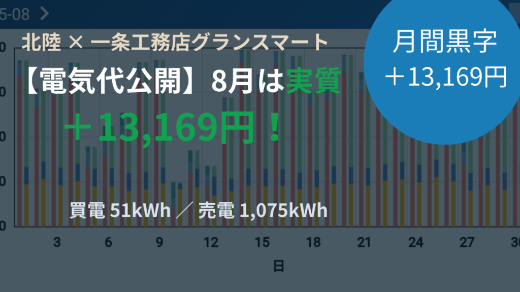 2025年8月の電気代を公開。北陸の3人家族が一条工務店グランスマート+太陽光11.75kW+蓄電池で生活した結果、全国平均1.3万円に対し実質+13,169円の収支に。 -